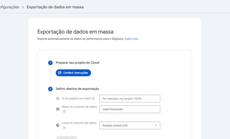 - Inicie a Exportação: Após preencher os campos, clique em “Continuar”. O Search Console iniciará o processo de exportação, que pode levar algum tempo para a primeira carga de dados.